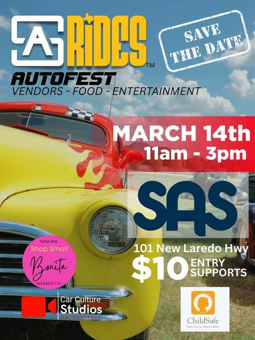 Join us for the second annual SA Rides Auto Fest, inspired by local car enthusiasts. Bring out your “SA Rides,” whether they’re old or new, and share your stories with us! ?? SAS Choice Award ?? SA Rides Choice Award ?? Texas Auto Culture Award • All vehicles welcome • $10 vehicle entry supports Child Safe • Vehicle registration at SA Rides • Local vendors by Bonita Market Co. • Event is free to attend and park for spectators, family and pet friendly Bonita Market Co. is the only point of contact for vendors.